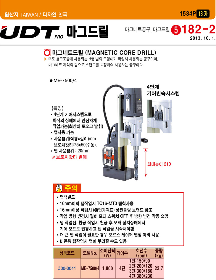 [UDT] ¸¶±×³×Æ® µå¸±(ME-7500/4, 4´Ü¼ÓµµÁ¶Àý, 75ÆÄÀÌx50mm, 1.8Kw, 23.7Kg)(MAGNETIC CORE DRILL)