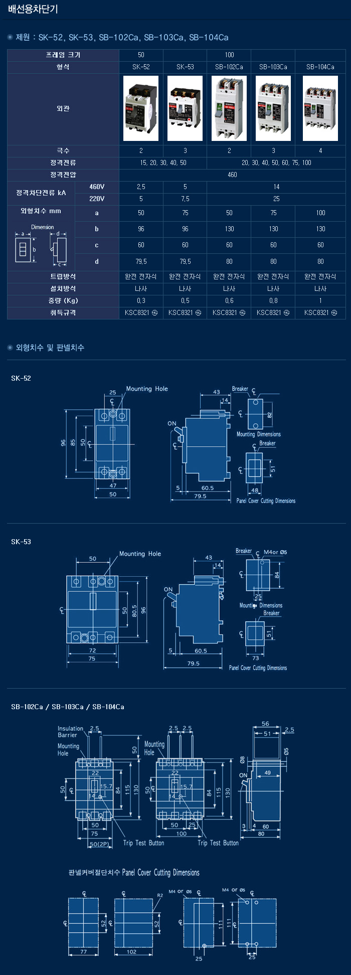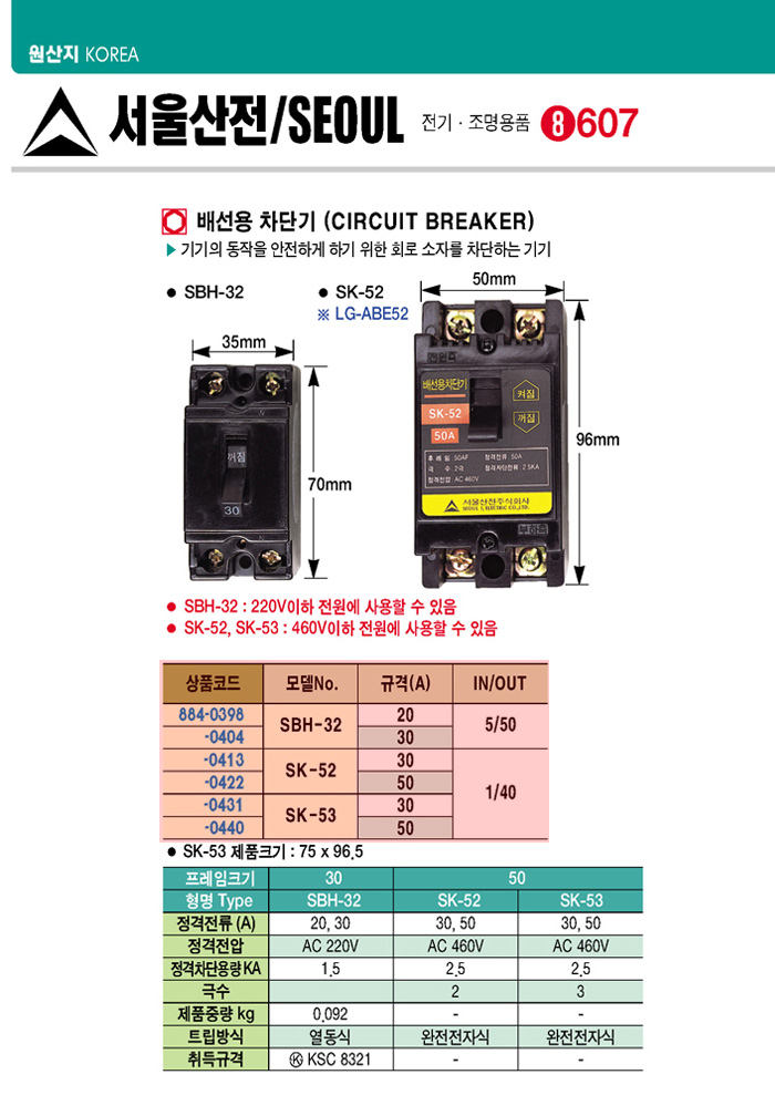 [¼­¿ï»êÀü]¹è¼±¿ë Â÷´Ü±â(SK-52 , 50A, 5KA)(CIRCUIT BREAKER)