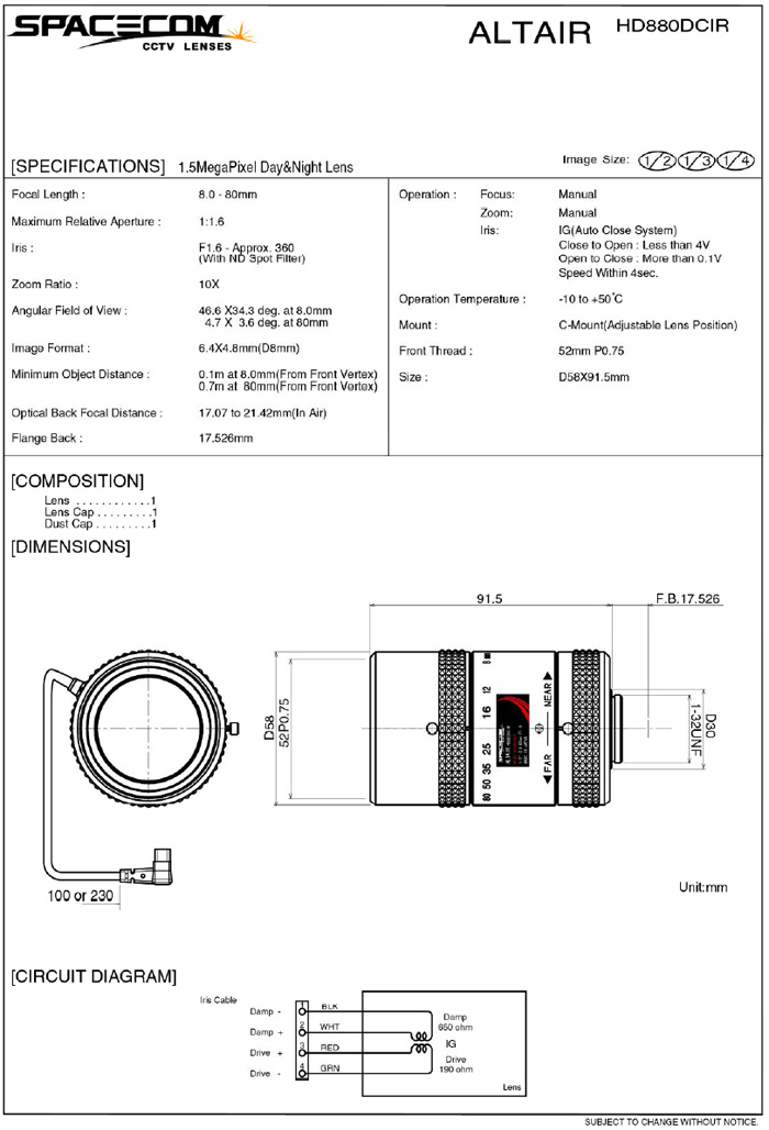 [SPACECOM]IRÁ¶¸í¿ë·»Áî/Àû¿Ü¼±Á¶¸í·»Áî HD880DCIR DC IRIS 1/2" 1.5Mega Pixels Day and Night Lens(°ßÀû¿äû)