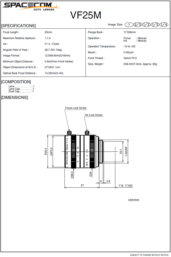 [SPACECOM]Machine Vision Lenses VF25M 1¡± 25mm(FA¿ë)(°ßÀû¿äû)