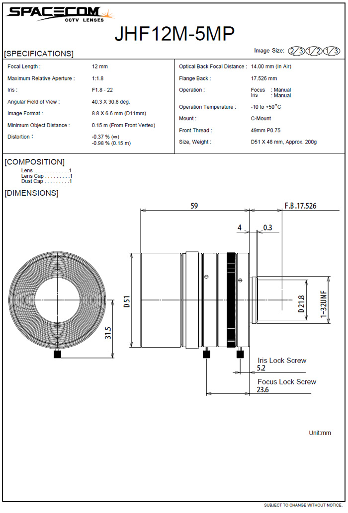 [SPACECOM]Mega Pixels Lens JHF12M-5MP 2/3¡± 12mm(5Mega Pixel Lens)(°ßÀû¿äû)