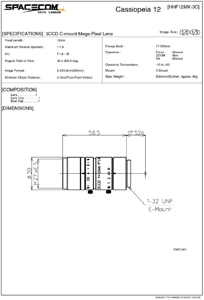 [SPACECOM]1.45Mega Pixel Lens for 3CCD HHF12MK3C 12mm C-mount 1/2"(°ßÀû¿äû)