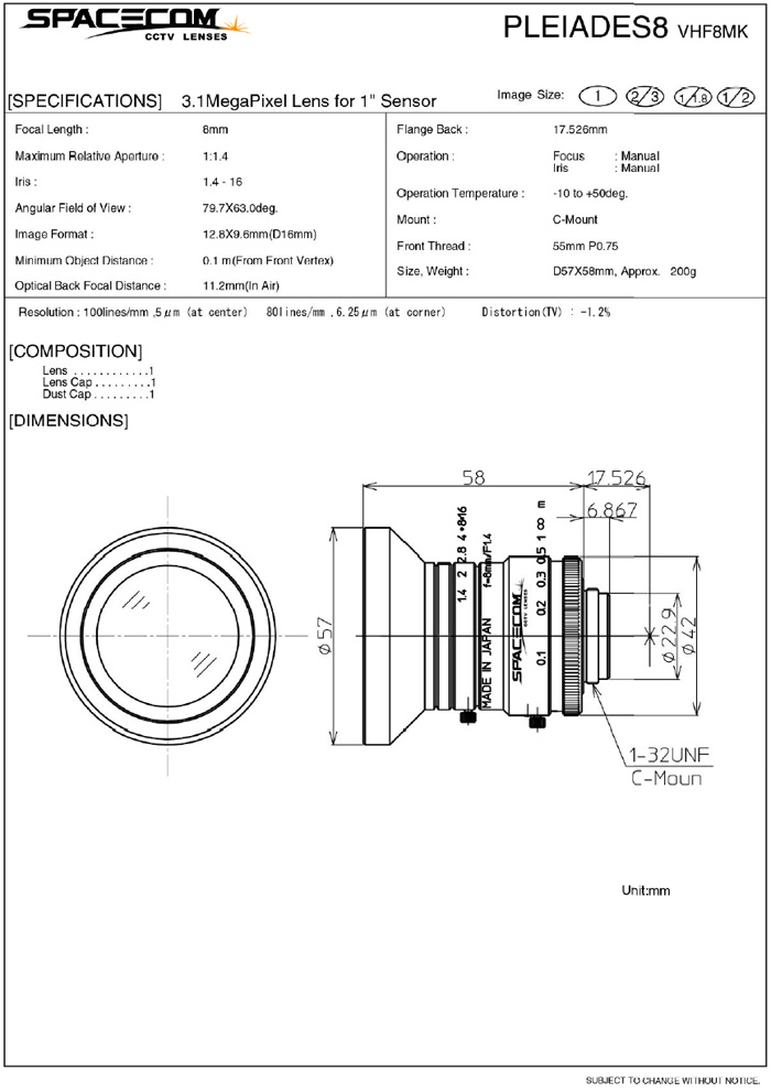 [SPACECOM]3.1Mega Pixel Lens VHF8MK 8mm 1"(°ßÀû¿äû)