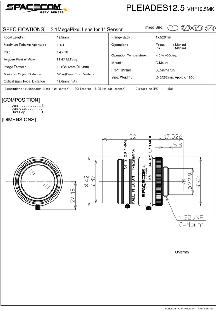 [SPACECOM]3.1Mega Pixel Lens VHF12MK 12.5mm 1"(°ßÀû¿äû)