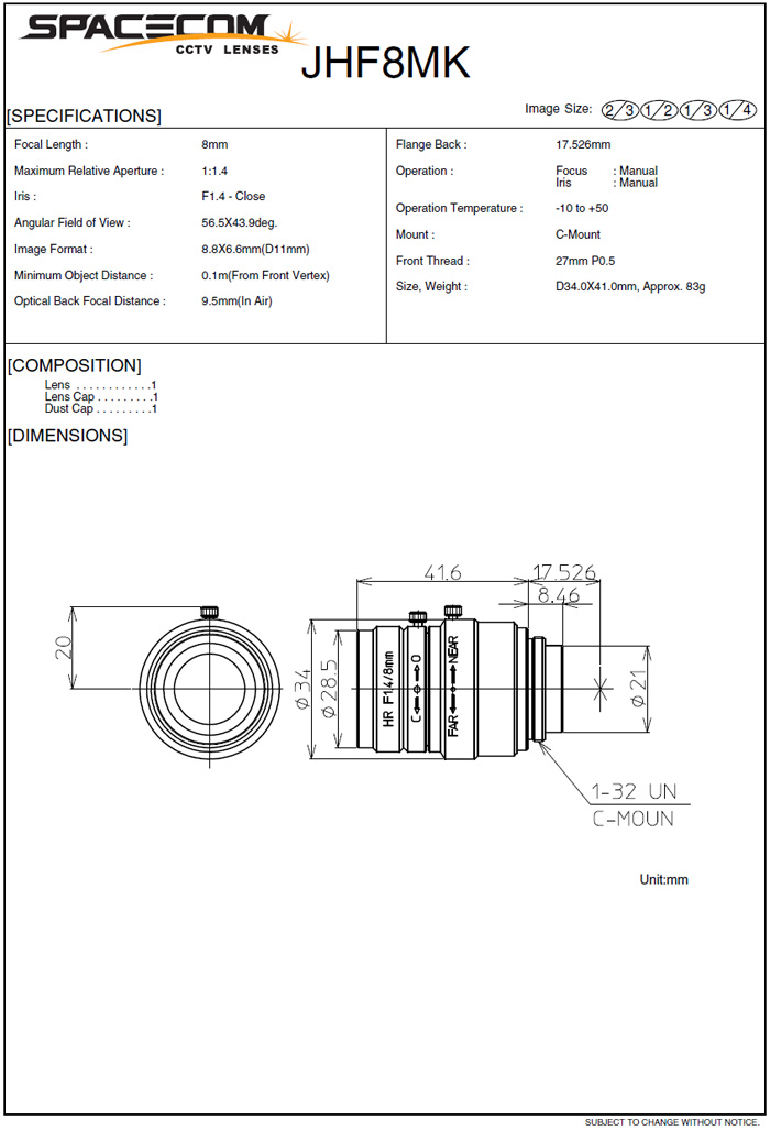 [SPACECOM]2Mega Pixel Lens JHF8MK 8mm 2/3"(°ßÀû¿äû)