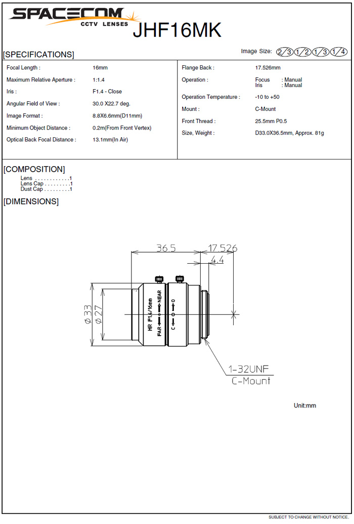 [SPACECOM]2Mega Pixel Lens JHF16MK 16mm 2/3"(°ßÀû¿äû)