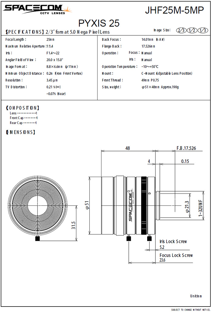 [SPACECOM]Mega Pixels Lens JHF25M-5MP 2/3¡± 25mm(5Mega Pixel Lens)(°ßÀû¿äû)