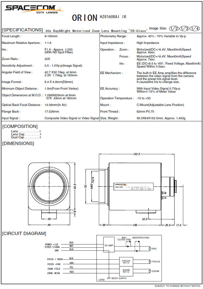 [SPACECOM]Day and Night Motorized Zoom Lens HZ8160RAIIR 20¹èÁÜ (8-160mm) 1/2" Auto IRIS (°ßÀû¿äû)