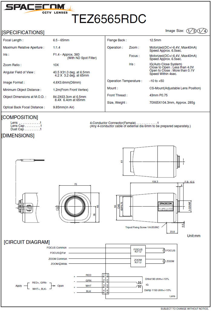 [SPACECOM]Motorized Zoom Lens TEZ6565RDC 10¹èÁÜ (6.5-65mm) 1/3" DC IRIS (°ßÀû¿äû)