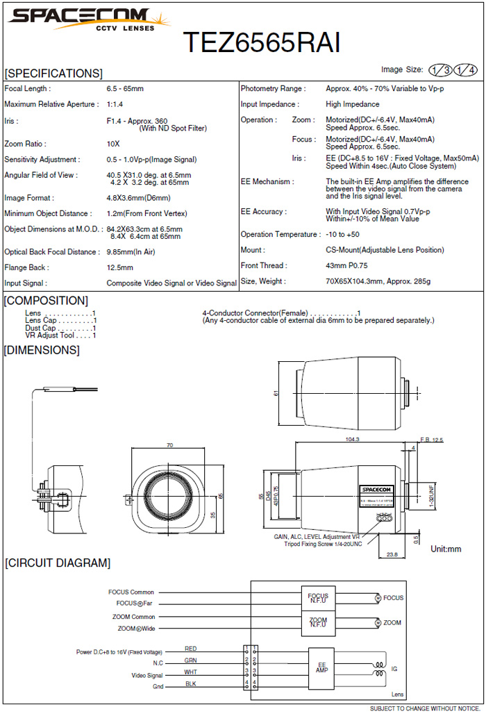 [SPACECOM]Motorized Zoom Lens TEZ6565RAI 10¹èÁÜ (6.5-65mm) 1/3" Video IRIS (°ßÀû¿äû)
