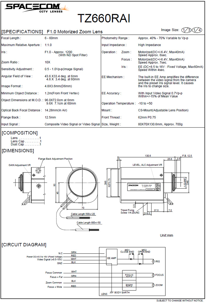 [SPACECOM]Motorized Zoom Lens TZ660RAI 10¹èÁÜ (6-60mm) 1/3" Video IRIS (°ßÀû¿äû)