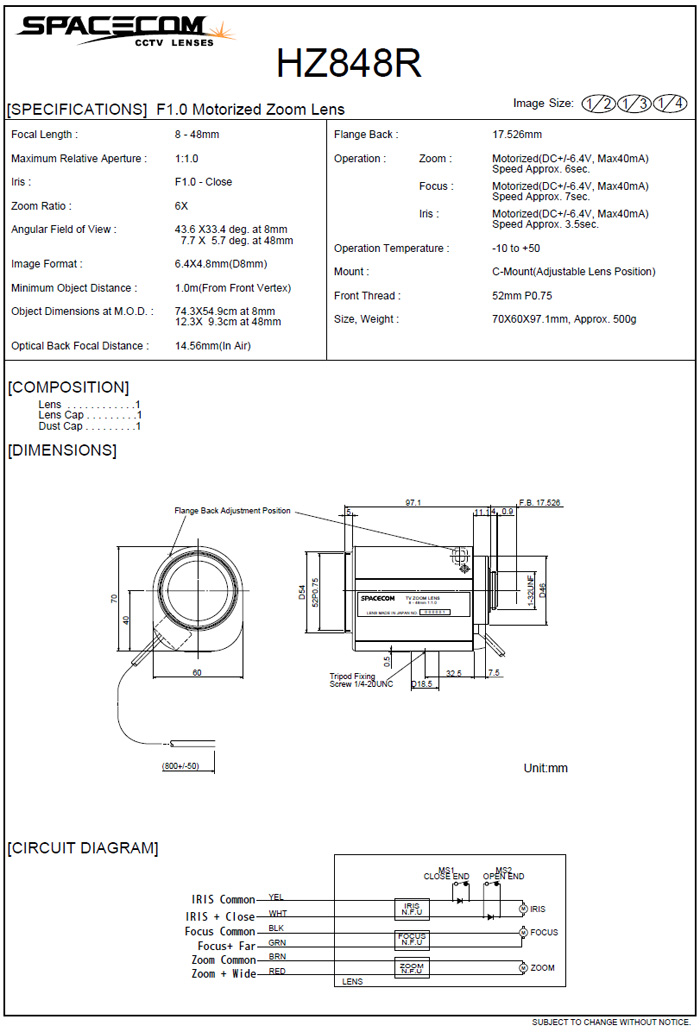 [SPACECOM]Motorized Zoom Lens HZ848R 6¹èÁÜ (8-48mm) 1/2" 3Motor (°ßÀû¿äû)