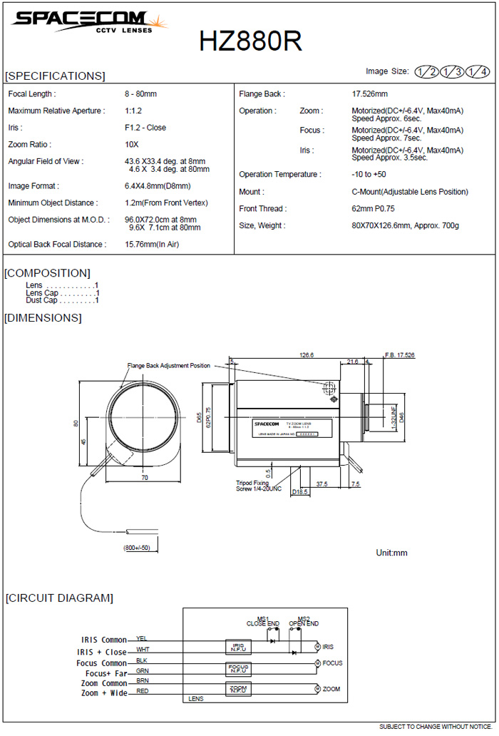 [SPACECOM]Motorized Zoom Lens HZ880R 10¹èÁÜ (8-80mm) 1/2" 3Motor(°ßÀû¿äû)