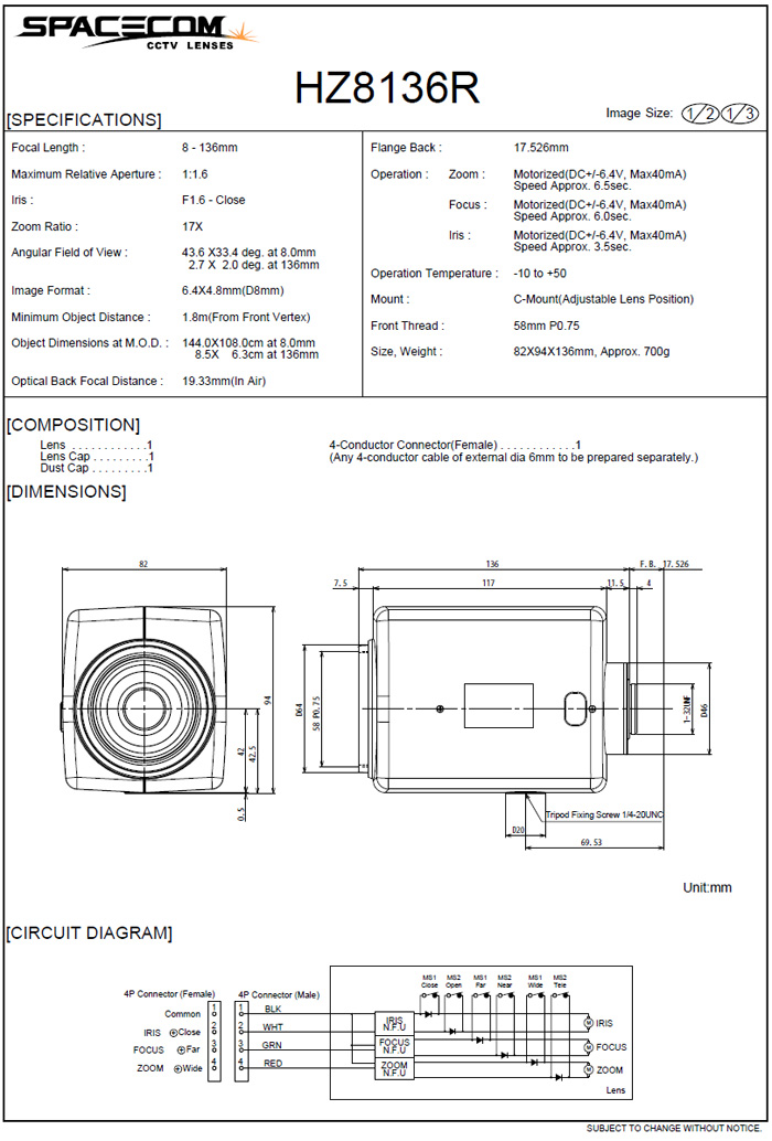 [SPACECOM]Motorized Zoom Lens HZ8136R 17¹èÁÜ (8-136mm) 1/2" 3Motor (°ßÀû¿äû)
