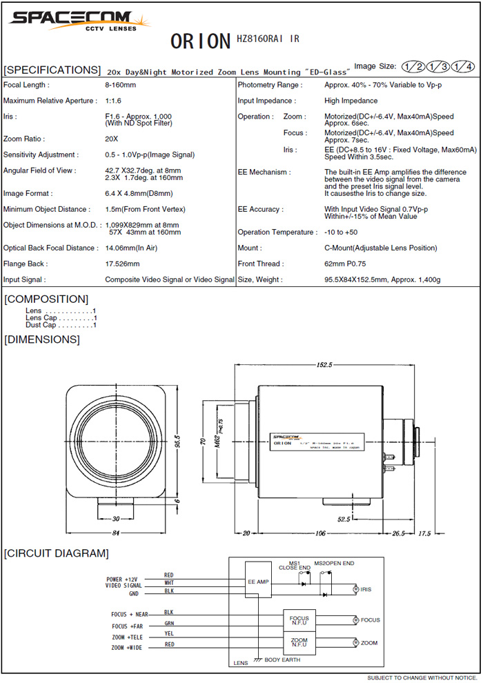 [SPACECOM]Motorized Zoom IR Lens HZ8160RAI IR 20¹èÁÜ (8-160mm) 1/2" Video IRIS (°ßÀû¿äû)