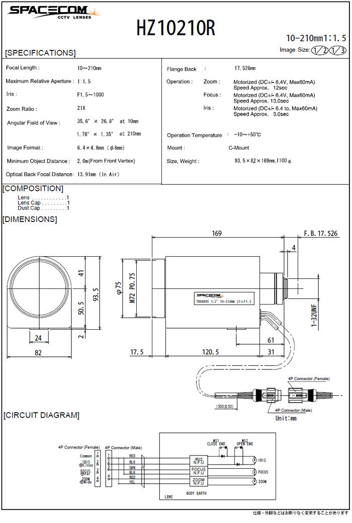 [SPACECOM]Motorized Zoom Lens HZ10210R 21¹èÁÜ (10-210mm) 1/2" 3Motor(°ßÀû¿äû)