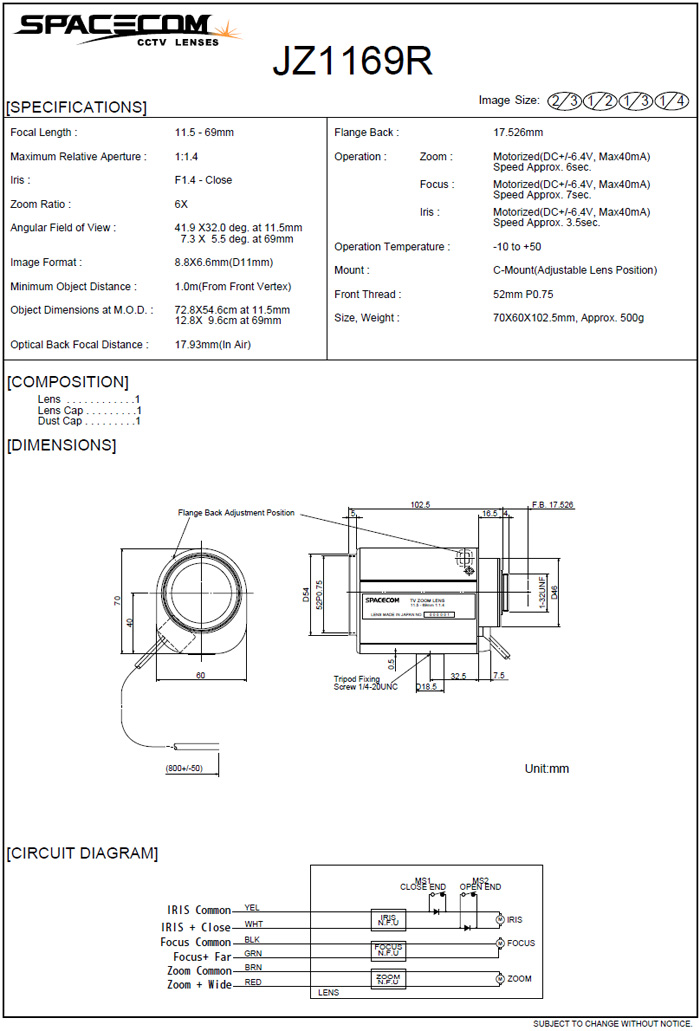 [SPACECOM]Motorized Zoom Lens JZ1169R 6¹èÁÜ (11.5-69mm) 2/3" 3Motor(°ßÀû¿äû)