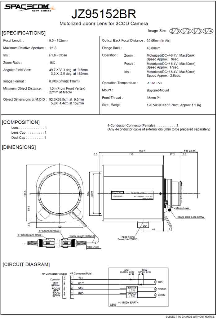 [SPACECOM]3CCD Camera Zoom Lens JZ95152BR 16¹èÁÜ (9.5-152) 2/3ÀÎÄ¡ Bayonet Mount (°ßÀû¿äû)