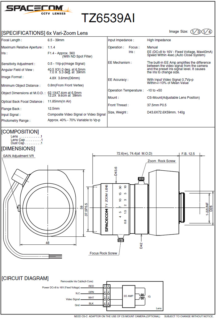 [SPACECOM]Manual Zoom Lens TZ6539M 6¹èÁÜ (6.5-39mm) 1/3ÀÎÄ¡ Video IRIS (°ßÀû¿äû)