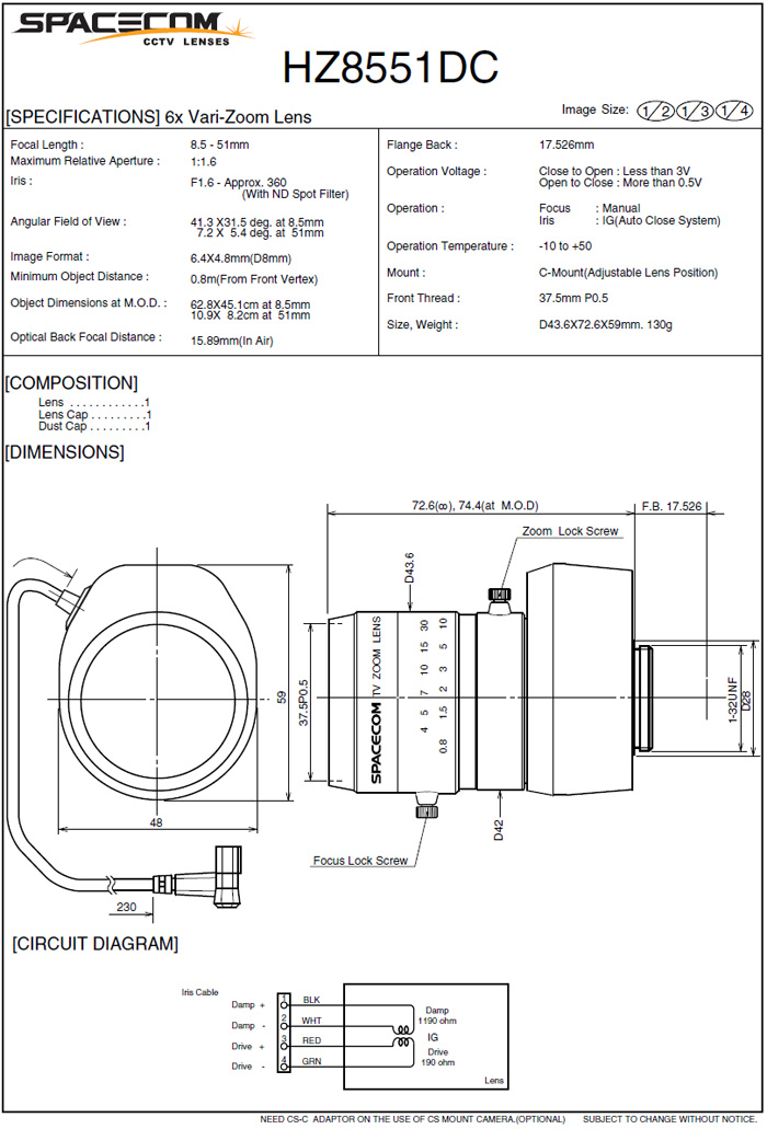[SPACECOM]Manual Zoom Lens HZ8551M 6¹èÁÜ (8.5-51mm) 1/2ÀÎÄ¡ DC IRIS (°ßÀû¿äû)