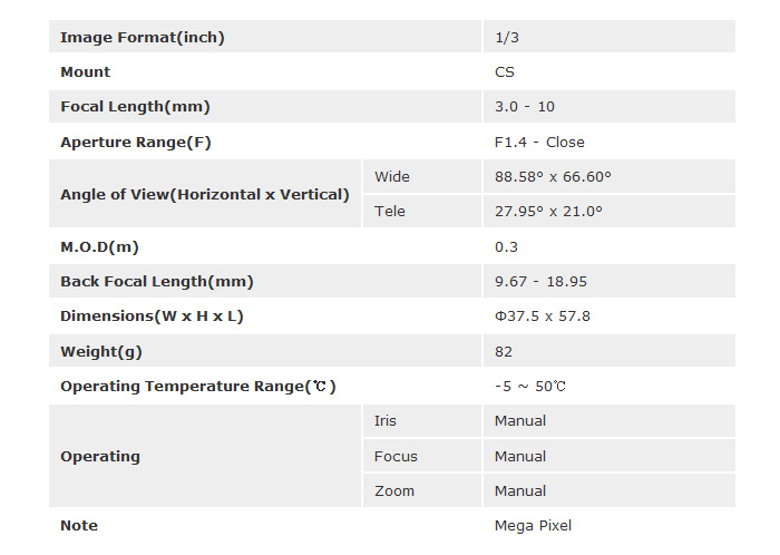 [TOKINA]Mega Pixel Lens TVR0314HD (3-10mm) 1/3ÀÎÄ¡ 3Motor(°ßÀû¿äû)