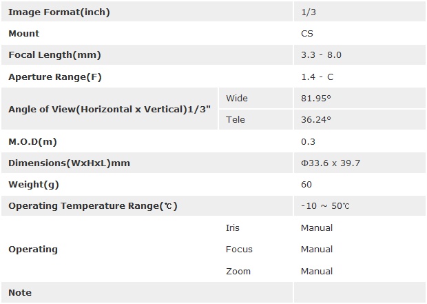 [TOKINA]Vari-Focal Lenses TVR3314(3.3 - 8.0mm) 1/3ÀÎÄ¡ (°ßÀû¿äû)