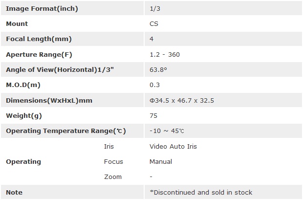 [TOKINA]Mono-Focal(fixed) Lenses TC0412AI(4mm) 1/3ÀÎÄ¡ (°ßÀû¿äû)