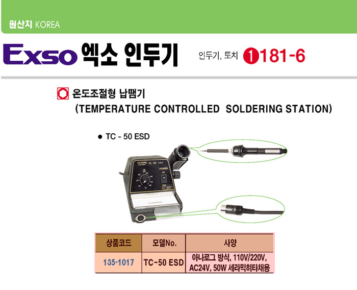 [Exso]¿ÂµµÁ¶ÀýÇü ³³¶«±â(TC-50 ESD, ¾Æ³¯·Î±× 110/220V, AC24V 50Watt)(Temperature Controlled Soldering Station)
