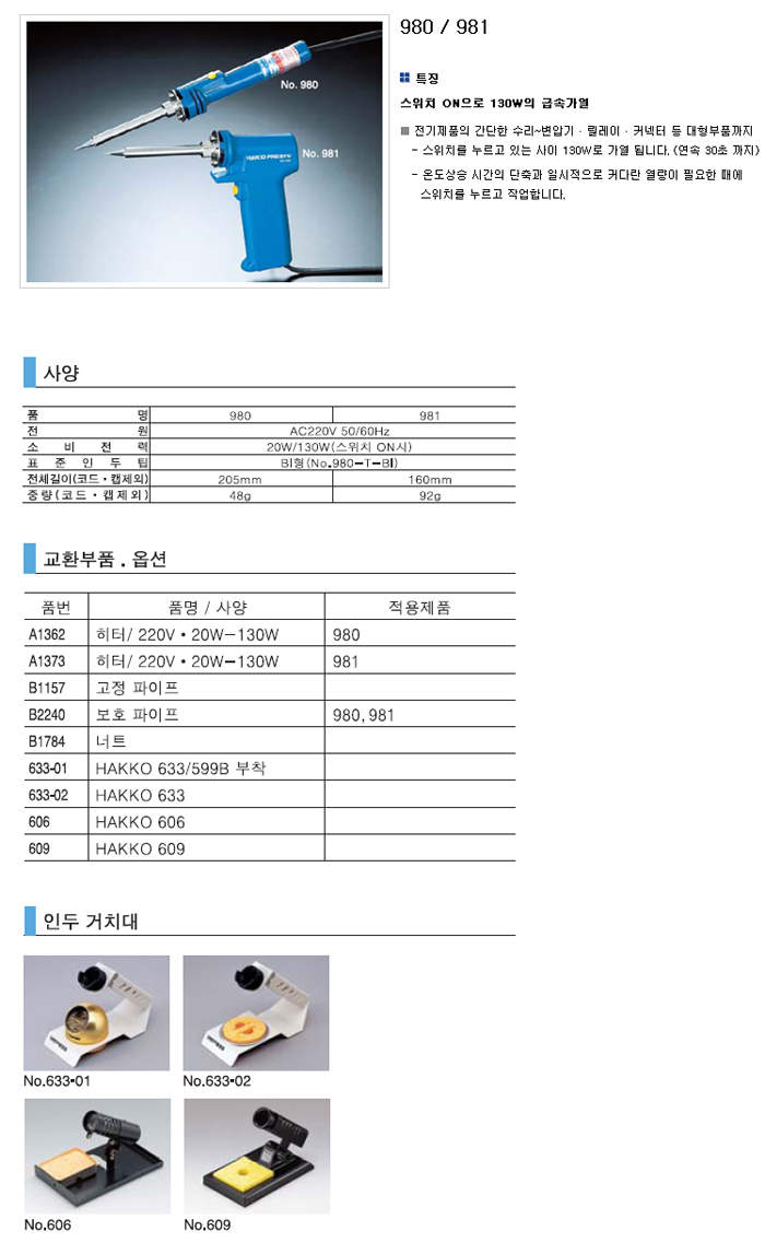 [HAKKO]¼¼¶ó¹ÍÀεαâ(980, 220V, 20-130Watt, ÀÏÀÚŸÀÔ, BIÇü NO.980-T-BÆÁ)(Ceramic Soldering Iron)(½ºÆ½Àεαâ)