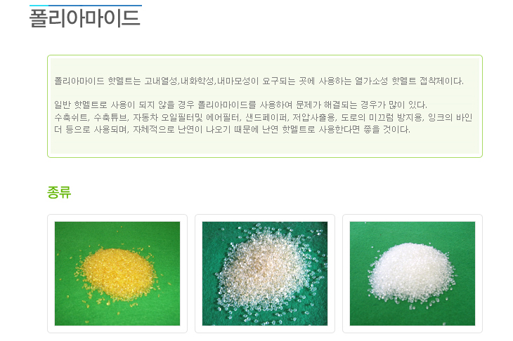 2) Æú¸®¾Æ¸¶ÀÌµå °è¿: Tack, °æµµ, ³»¿µµ°¡ ¿ì¼öÇÏ¿© ÃÖ±Ù ÇÖ¸áÆ® ¸ôµù¿ëÀ¸·Î ¸¹ÀÌ »ç¿ëµÇ¸ç ±âŸ ´Ù¾çÇÑ Á¦Á¶°øÁ¤ °ü·Ã ºÐ¾ß¿¡ »ç¿ëµË´Ï´Ù.