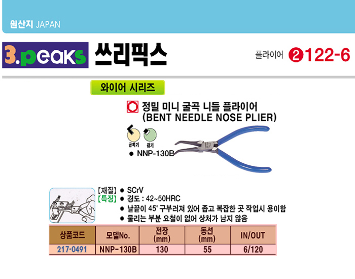 [3peaks] ¿ÍÀ̾î Á¤¹Ð ¹Ì´Ï ±¼°î ´Ïµé ÇöóÀ̾î(NNP-130B, 130mm)(Mini Bent Needle Nose Plier)