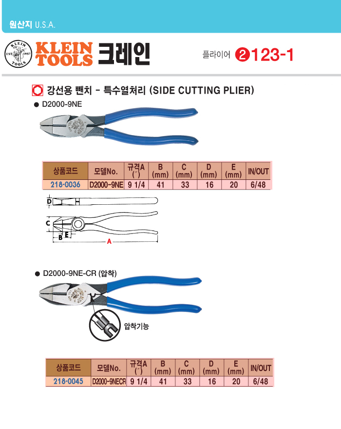 [Å©·¹ÀÎ] °­¼±¿ë »«Ä¡-Ư¼ö¿­Ã³¸®(D2000-9NE, 9 1/4ÀÎÄ¡)(Side Cutting Plier)