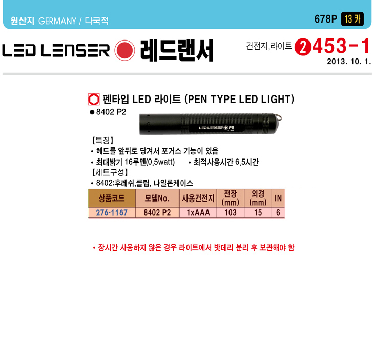 [·¹µå·£¼­] ÆæÅ¸ÀÔ LED ¶óÀÌÆ®(8402 P2, AAAx1°³, 103x15mm, 16·ç¸à/0.5Watt)(Pen Type LED Flashlight)