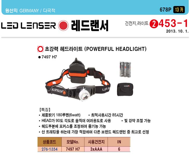 [·¹µå·£¼­] Ãʰ­·Â Çìµå¶óÀÌÆ®(7497 H7, AAAx3°³, 180·ç¸à/6Watt)(Powerful Headlight)
