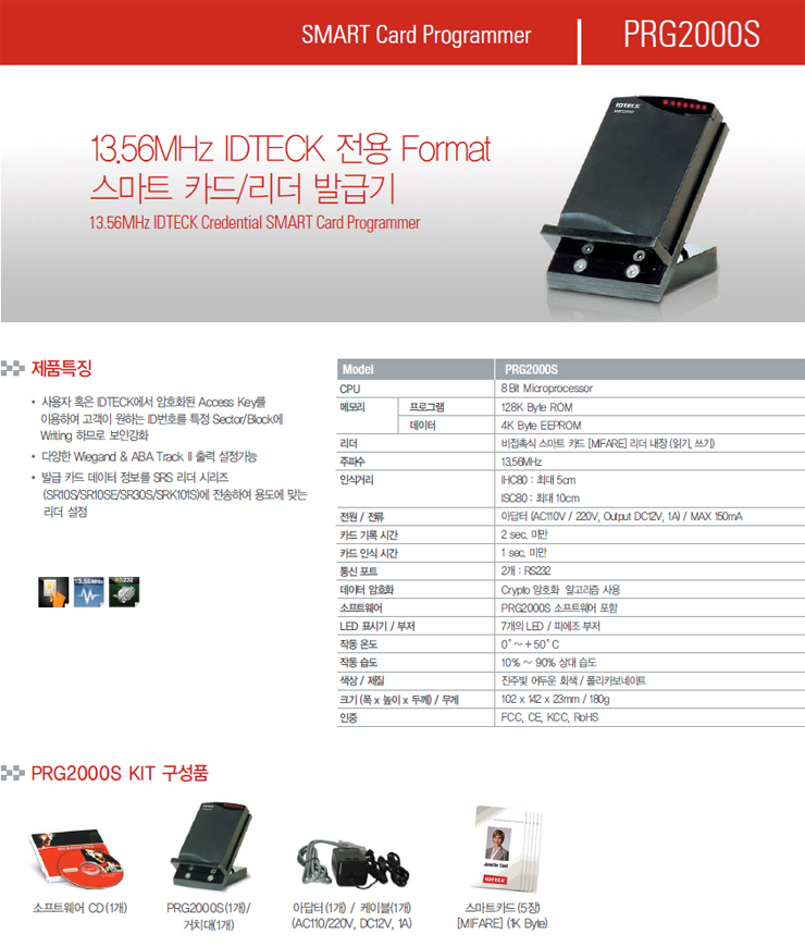 ±¸¼ºÇ° -. PRG2000S 1SET -. Smart Card Read/Write Software CD 1EA -. Power Adaptor 1EA -. RS-232C Jack Cable 1EA -. Table Holder 1EA -. Software Manual -. Smart Card 1Kbyte 5¸Å
