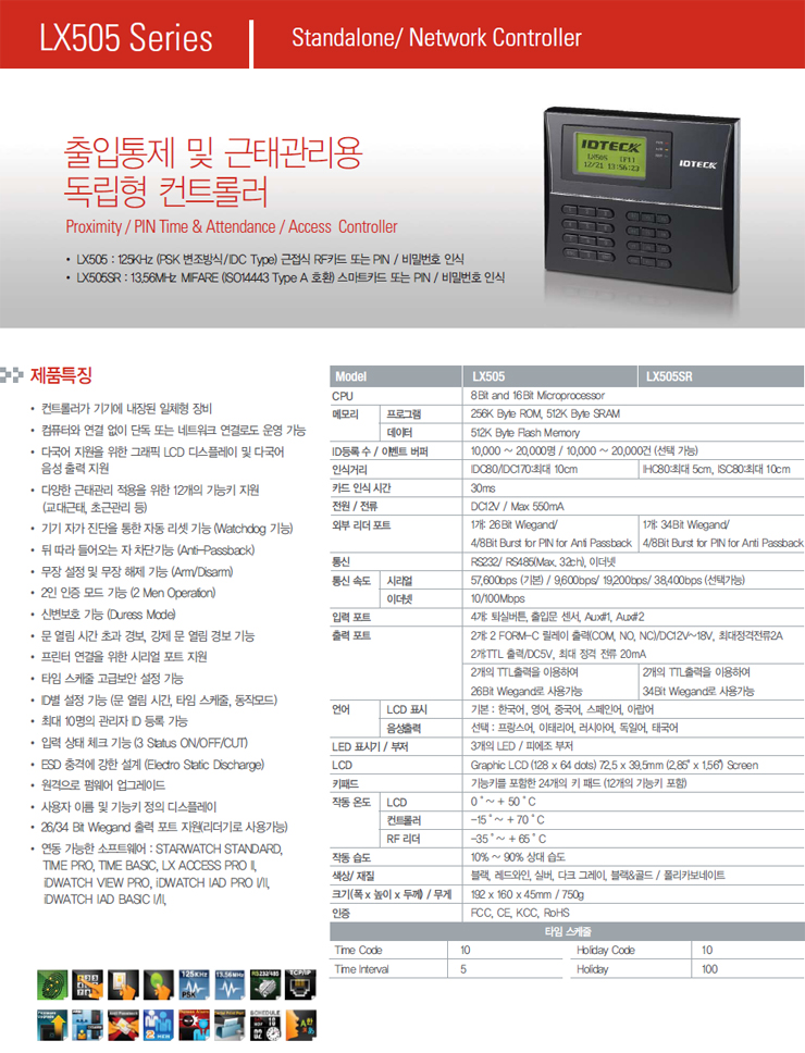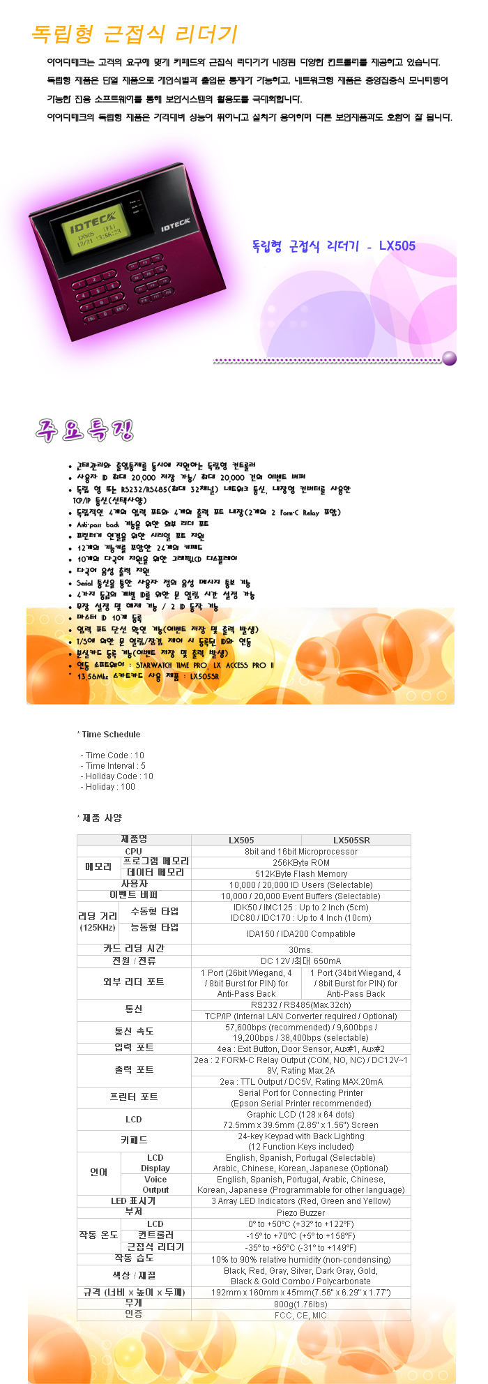 * Ç¥½Ã±Ý¾×Àº ±ÇÀå ¼ÒºñÀÚ °¡°ÝÀ¸·Î 2°³ÀÌ»óÀÇ °æ¿ì °ßÀûÀ» ¿äûÇϽøé ÃÖÀûÀÇ °ßÀû±Ý¾×À» Á¦½ÃÇÕ´Ï´Ù. * ¼¿ï/ºÎ»ê/Æ÷Ç×/°æ³²(â¿ø, ¸¶»ê, ÁøÇØ, ÁøÁÖ)/Àü³²(¼øÃµ, ±¤¾ç) Áö¿ªÀº ¼³Ä¡¸¦ Áö¿øÇÕ´Ï´Ù. -. 13.56MHZ RF Reader(34Bit Wiegand Output) + ºñ¹Ð¹øÈ£ + À½¼ºÁö¿ø -. ÇÑ±Û ±×·¡ÇÈÁö¿ø(24Keypad, LCDÆ÷ÇÔ) -. Åë½Å¹æ½Ä : RS-232C / RS-485 -. Auto Sensor ³»Àå(1:N Identification) -. Áö¿ø ¼ÒÇÁÆ®¿þ¾î : Time Pro 2006 ȤÀº LX Access Pro II ¼±Åð¡´É(º°¸Åǰ) -. ÄÉÀ̽º »ö»óÀº ÁöÁ¤ÇÒ ¼ö ¾ø½À´Ï´Ù.(Àç°í»óȲ¿¡ µû¶ó ÃâÇϵ˴ϴÙ.) |