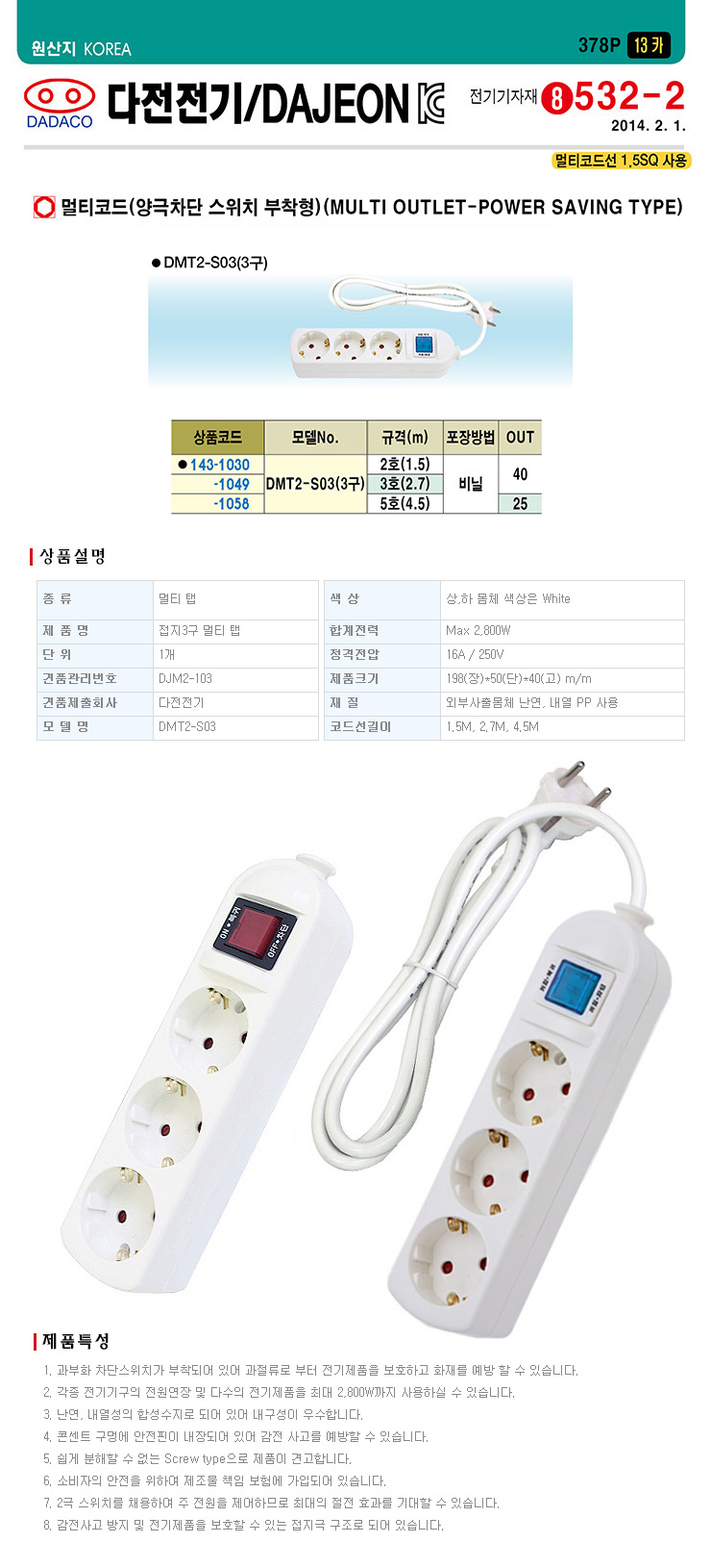 [´ÙÀüÀü±â]¸ÖƼÅÇ/¸ÖƼÄÚµå/¸ÖƼÄܼ¾Æ®(DMT2-S03, 3±¸)(Multi Outlet-Power Saving Type)-¾ç±ØÂ÷´Ü½ºÀ§Ä¡ ºÎÂøÇü