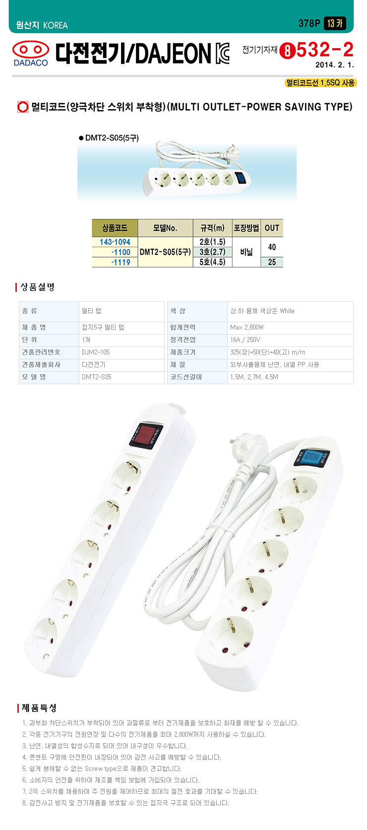 [´ÙÀüÀü±â]¸ÖƼÅÇ/¸ÖƼÄÚµå/¸ÖƼÄܼ¾Æ®(DMT2-S05, 5±¸)(Multi Outlet-Power Saving Type)-¾ç±ØÂ÷´Ü½ºÀ§Ä¡ ºÎÂøÇü