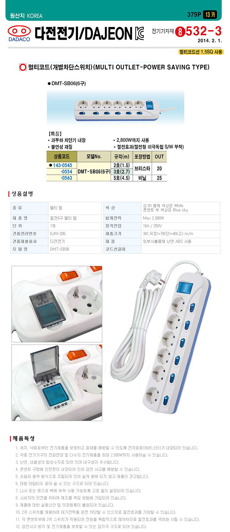 [´ÙÀüÀü±â]¸ÖƼÅÇ/¸ÖƼÄÚµå/¸ÖƼÄܼ¾Æ®(DMT-SB06, 6±¸)(Multi Outlet-Power Saving Type)-°³º°Â÷´Ü½ºÀ§Ä¡