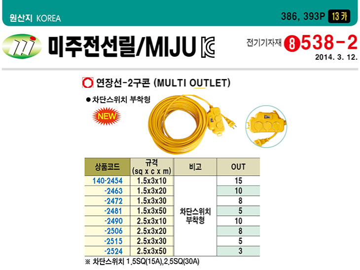 [¹ÌÁÖ]Â÷´Ü½ºÀ§Ä¡ ºÎÂøÇü ¿¬Àå¼±/3±¸ÄÜ(1.5Sq/3Core)(Multi Outlet)