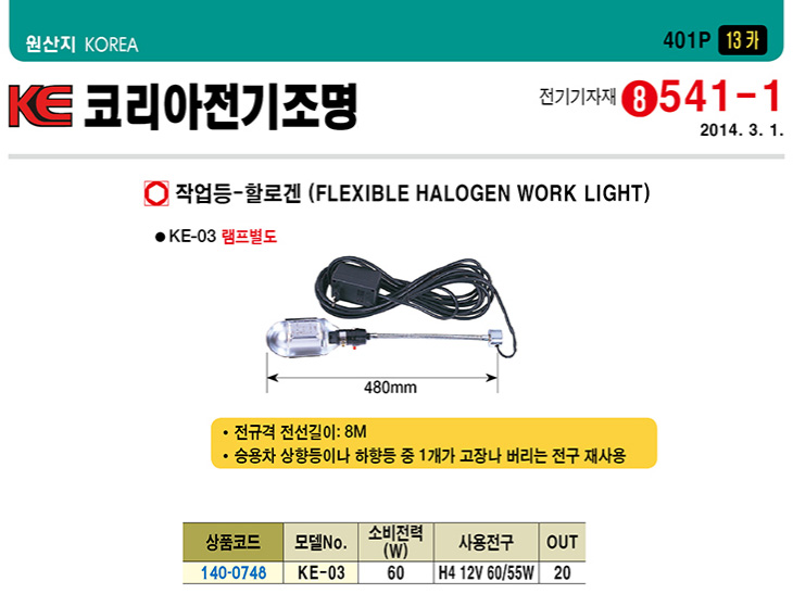 [KE]ÇÒ·Î°Õ ÀÛ¾÷µî(KE-03,ÀÚ¼®½Ä/60Watt/½Â¿ëÂ÷¿ë Çҷΰշ¥ÇÁ,H4 12V 60/55Watt Àü±¸»ç¿ë)(Flexible Halogen Working Light)