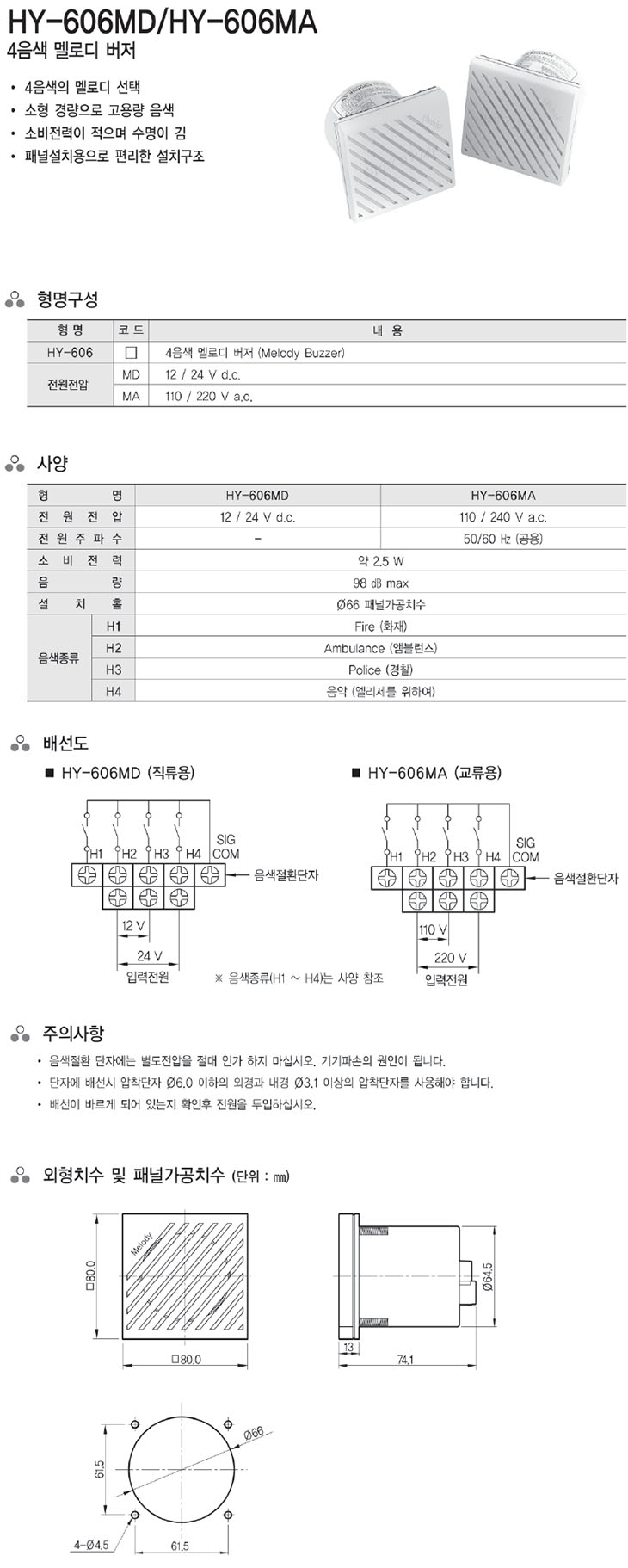 [HYNUX]4À½»ö ¸á·Îµð ¹öÀú (HY-606MD,66¨ª,12VDC/24VDC,»ç°¢ÆÐ³Î ³ëÃâÇü,98dB)