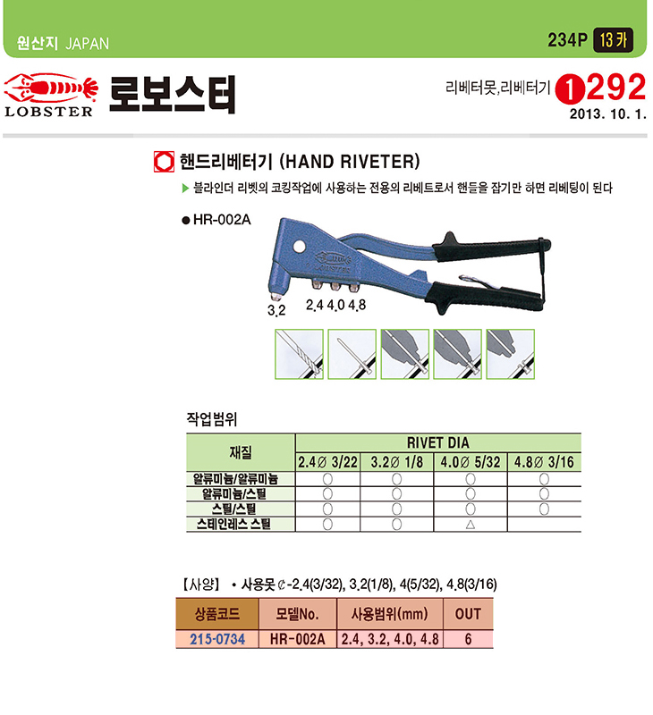 [LOBSTER] Çڵ帮º£Åͱâ(HR-002A,2.4/3.2/4.0/4.8mm)(Hand Riveter)