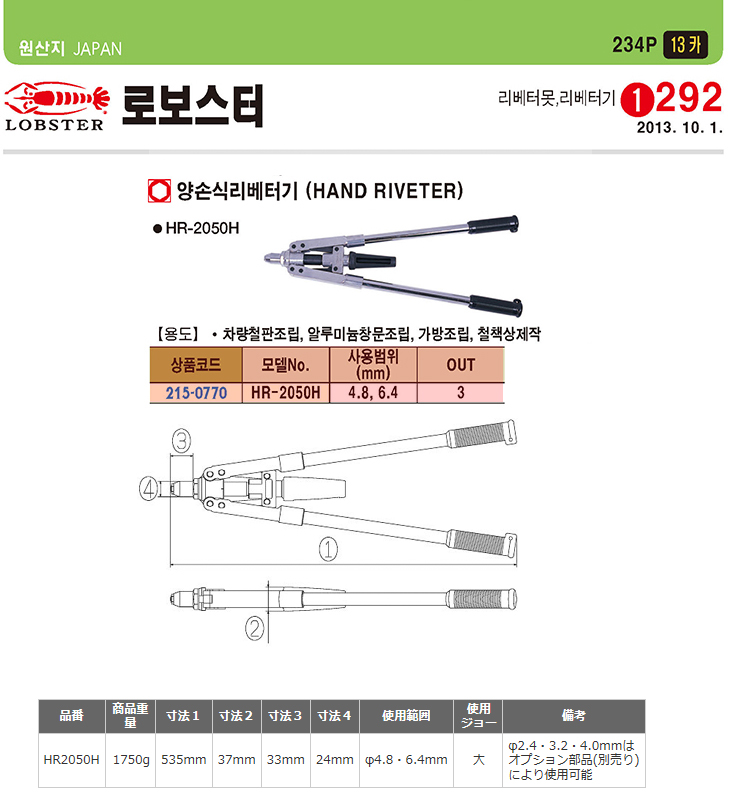 [LOBSTER] ¾ç¼Õ½Ä ¸®º£Åͱâ(HR-2050H,4.8/6.4mm)(Hand Riveter)