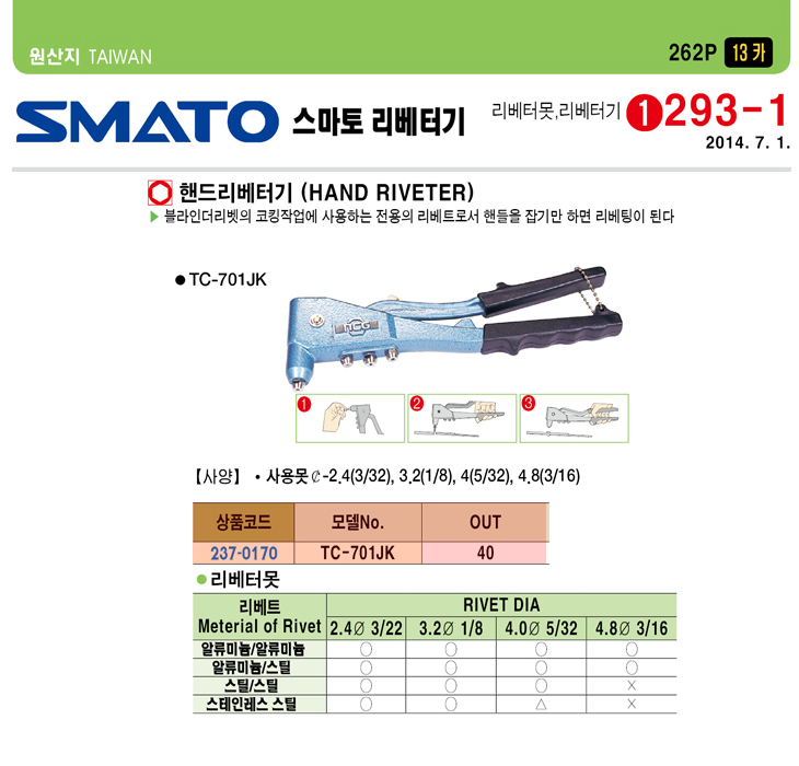 [SMATO] ÇÚµå ¸®º£Åͱâ(TC-701JK,2.4/3.2/4.0/4.8mm)(Hand Riveter