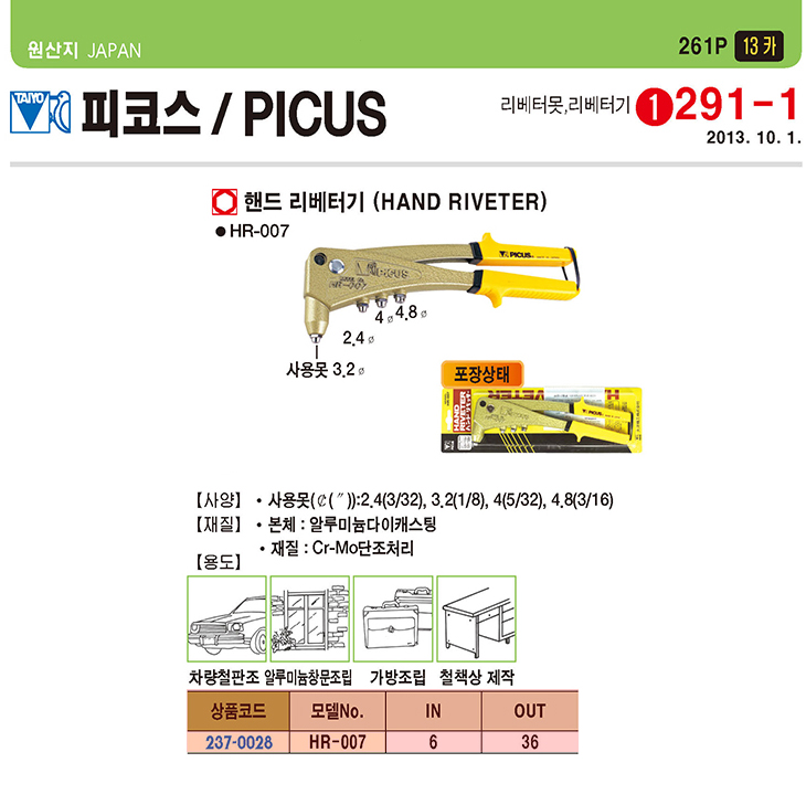 [PICUS] ÇÚµå ¸®º£Åͱâ(HR-007,2.4/3.2/4.0/4.8mm)(Hand Riveter)