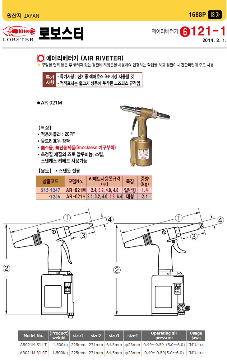 [LOBSTER] ¿¡¾î ¸®º£Åͱâ(AR-021M,2.4/3.2/4.8mm,½ºÅÙ¸ø Àü¿ë)(Air Riveter)
