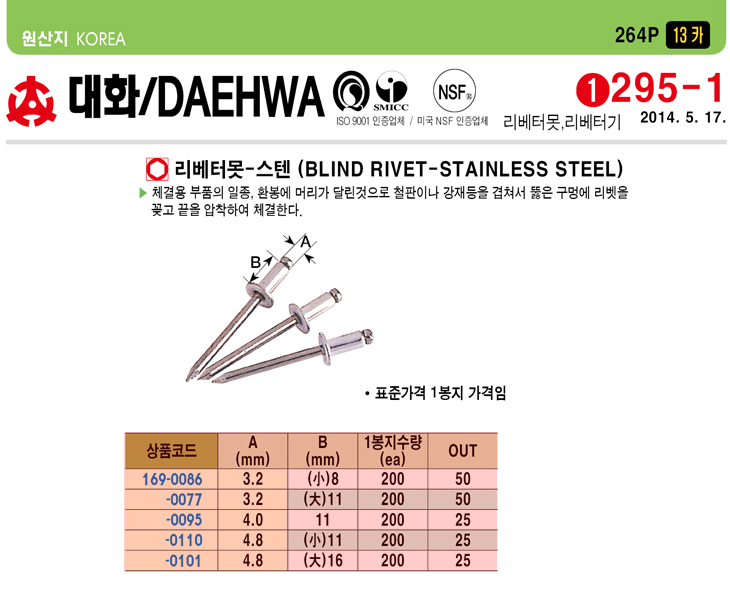 [´ëÈ­] ¸®º£Å͸ø ½ºÅÙ·¹½º(3.2x8mm,200°³¹­À½)(Blind Rivet Aluminum)