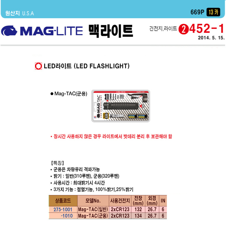[¸Æ¶óÀÌÆ®] LED ¶óÀÌÆ®/·£ÅÏ/¼ÕÀüµî/ÈÄ·¹½¬(Mag-TAC ±º¿ë, CR123x2°³, 132x26.7mm)(LED FLASHLIGHT)(¹èÅ͸®´Â Á¦¿Ü)