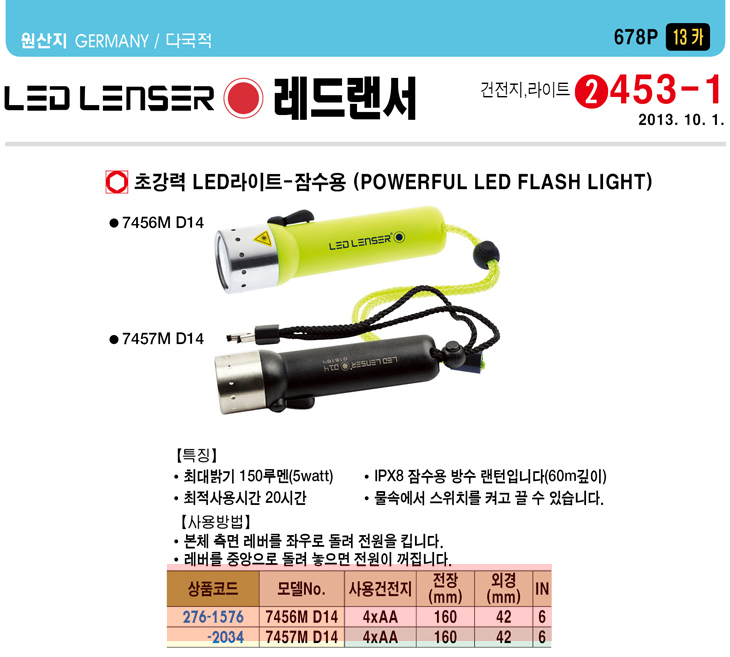 [·¹µå·£¼­] Ãʰ­·Â ¼ö¿ë LED ¶óÀÌÆ®(7457M D14, AAx4°³, 160x42mm, 150·ç¸à/5Watt, °ËÁ¤»ö/¹æ¼öÇü)(Powerful LED Flashlight)